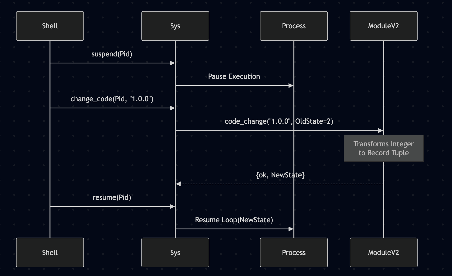 The key sequence is 8, 9, and 10: we suspend the process, reload the code (calling code_change), then resume. On 11, we see the state has changed from a single integer into the tuple record.