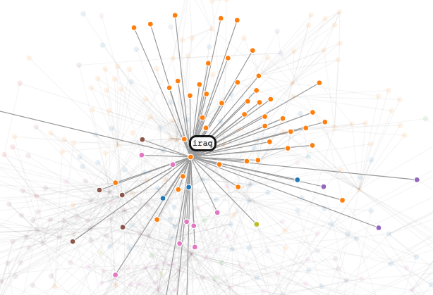 Here, I've got all my notes with connections to Iraq highlighted. While most of them are the same color, the ones that are not are colored because the Leiden community detection algorithm put them into another group, in this case, the group of things relating to "foreign fighters".
