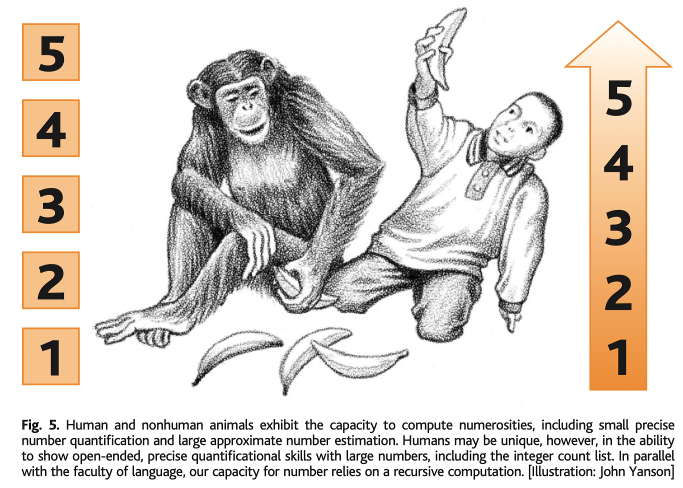 I was reading a paper by Hauser, Chomsky, and Finch on how to approach the study of linguistics, and they distinguish between what they call an FLN and a FLB, or a faculty of language narrow, and a faculty of language broad. In short, they define FLN to be centered around the idea of recursion, that the discovery of recursion is the key distinguishing feature for human languages vs animal languages. They provide the example that human babies can infer the existence of "4" after learning 1, 2, and 3, but primates require learning each one individually. They've got this diagram to show:
