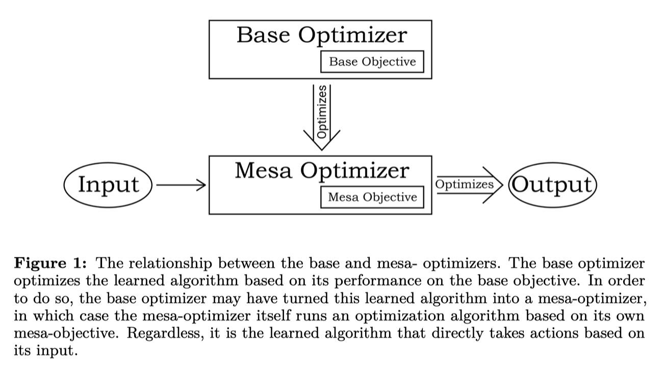 Hubinger et al wrote about the theoretical concept of a "mesa optimizer". This is the concept that if you teach a model to do something, and subject it to intense evolutionary pressure, you can end up with what’s known as a "mesa optimizer". One example given in the paper is teaching models to play Chess/Shogi/Go, where after enough iterations, the model may simply develop a heuristic tree pruning algorithm. In another example, we could think about solving a maze: you start off with the model learning to explore every possible maze path, but eventually it could develop a generic path-finding algorithm like A*. In these two cases, the heuristic tree-pruning algorithm and A* are both "mesa optimizers". In other words: the regular optimizer (such as stochastic gradient descent) develops the mesa optimizer: