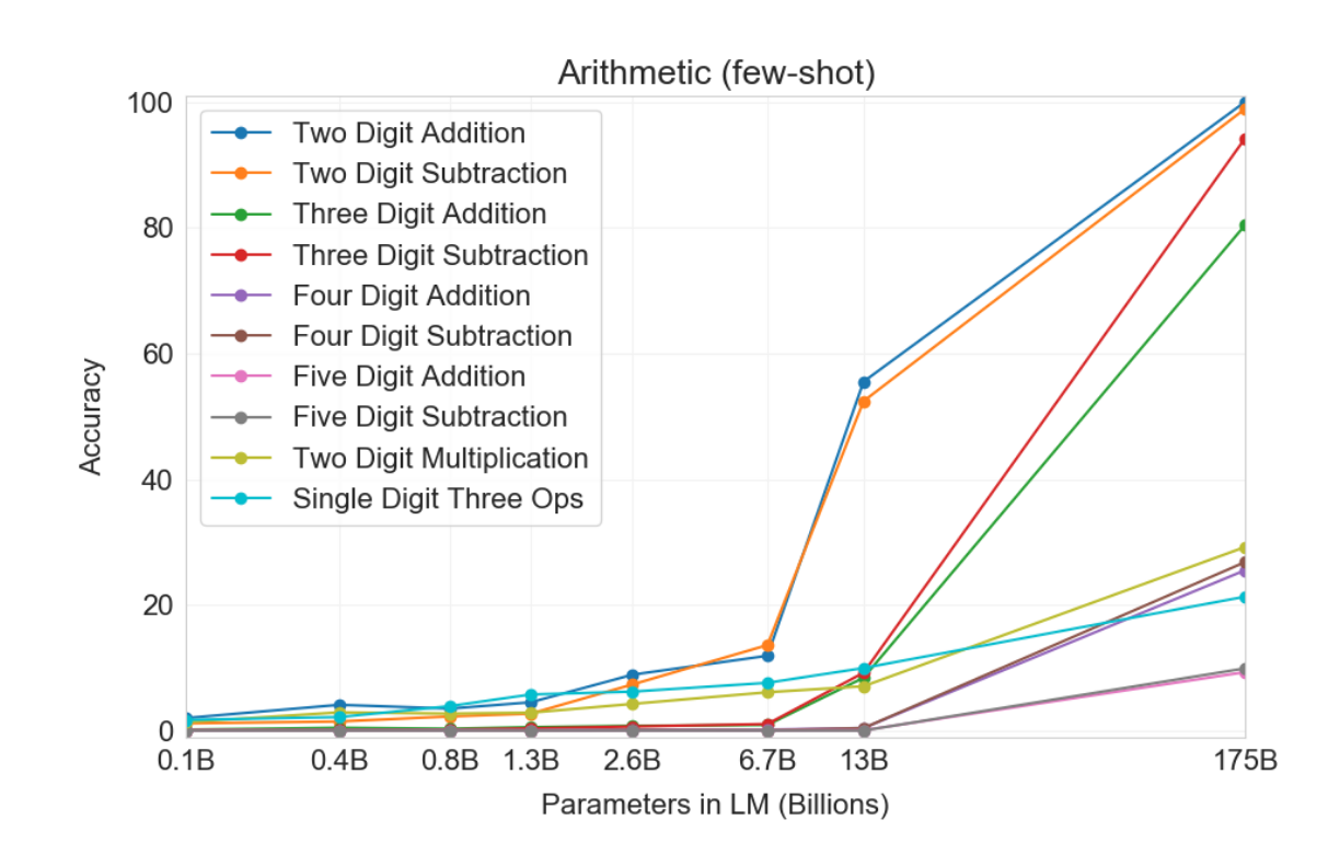 So if it follows that mesa optimizers and languages are similar in that they both capture more efficient forms of a problem, what does this idea do for us? For one, mesa optimizers are purely theoretical (although Deepmind has claimed they developed a proto-one), but language recursion is not. Language recursion via the merge operation has taken a particular role within a small part of our brain, which presents another quandary: if language recursion via the merge operation is such a key component, why would it, evolutionarily speaking, be bottlenecked to a single portion of the brain? To me, I see this as we’re in the early stages of evolution building specific components for recursion: our brains have not fully evolved to the point where multiple parts can perform the merge operation. But despite that, we’ve been able to do a lot with only a single portion! For Chomsky, this is a major evolutionary leap, not an iterative one. We did not slowly get to recursion, but rather we managed to develop it, and suddenly the modes of communication dramatically multiplied. Speculatively speaking, this means that, if mesa optimizers were to develop, their evolution would not be iterative, I would expect a mesa optimizer to emerge out of the blue at some point, once we’ve reached neural networks with sufficient dataset size, or computational capability, just as GPT-3 does not demonstrate the ability to do single digit arithmetic until 1B parameters, but the jump is quite dramatic (from https://arxiv.org/abs/2005.14165):