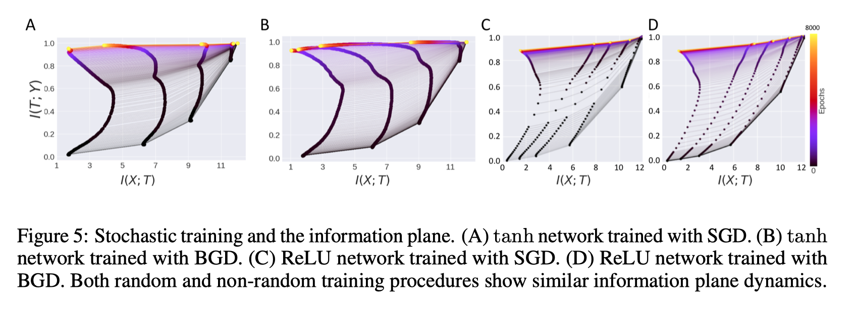 What's interesting here is that you can see tanh networks make a beeline for compression towards later epochs, but the ReLUs do not, which means that information must be preserved somehow within the ReLUs. The question then becomes: was the information complexity of the input dataset not high enough to exhibit compression, or do ReLUs simply never exhibit compression and therefore are unable to learn certain types of input?