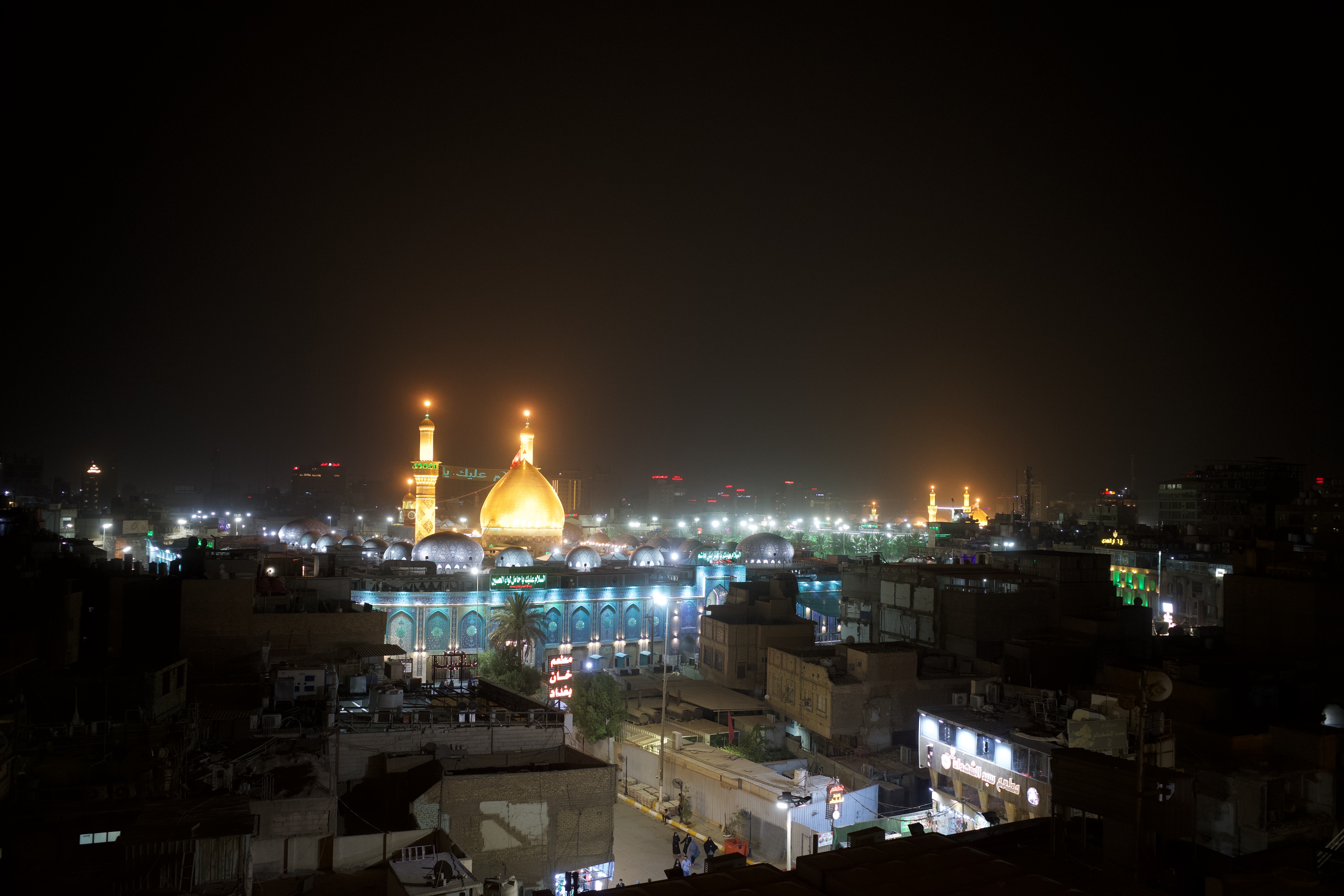 Karbala is a city of dual significance: it's a primary shrine city in Iraq (alongside Najaf) and the historical site of the Battle of Karbala, which saw the last stand of Hussein, one of the 12 Imams in Shi'a Islam. The city houses shrines to Imams Abbas and Hussein, with Hussein's shrine marked by prominent golden domes in the foreground and Abbas' shrine to the right.